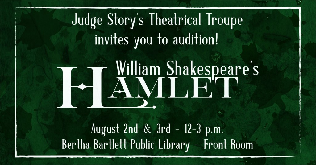 Auditions are open from 12-3 pm in the front room of the library, so come prepared with a 1-2 minute speech from another Shakespeare play besides Hamlet. It does not need to be memorized, you can have a copy with you!