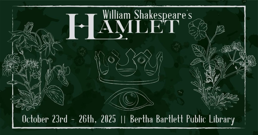 Join us at the newly-renovated Bertha Bartlett Public Library Performance Hall for our fall production of Hamlet! Shakespeare’s most famous tale of revenge and political intrigue will be given a modern setting and voice, showing how timeless this over 400-year-old play truly is.