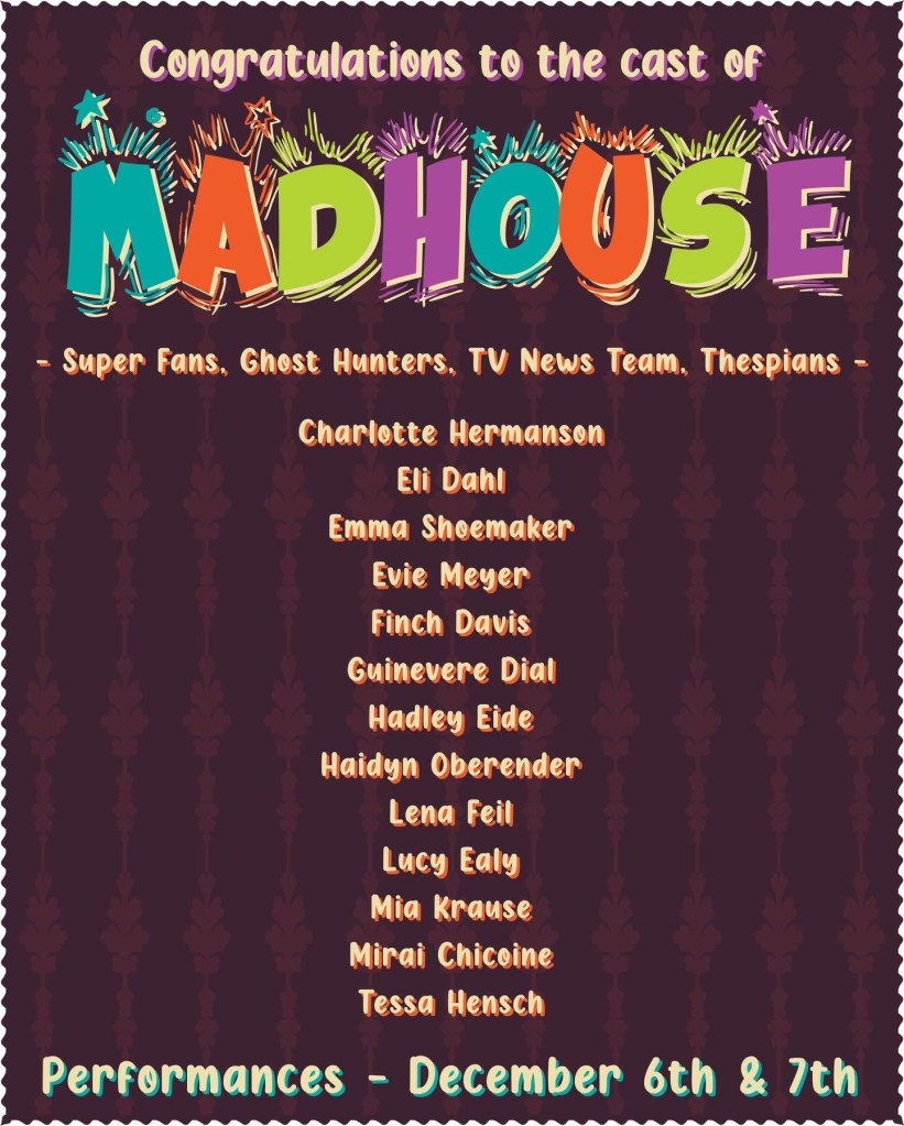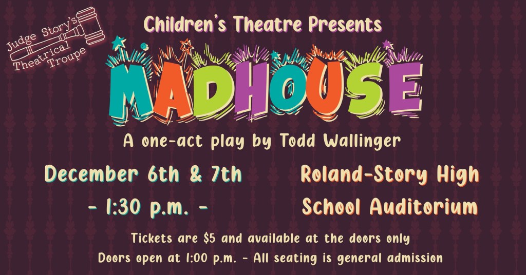 Join us December 6th and 7th for our Children’s Theatre production of Madhouse! This hilarious show will be playing at 1:30 p.m. at the Roland-Story High School Auditorium. Tickets are $5 and are available at the door, which open at 1:00 p.m. for seating!